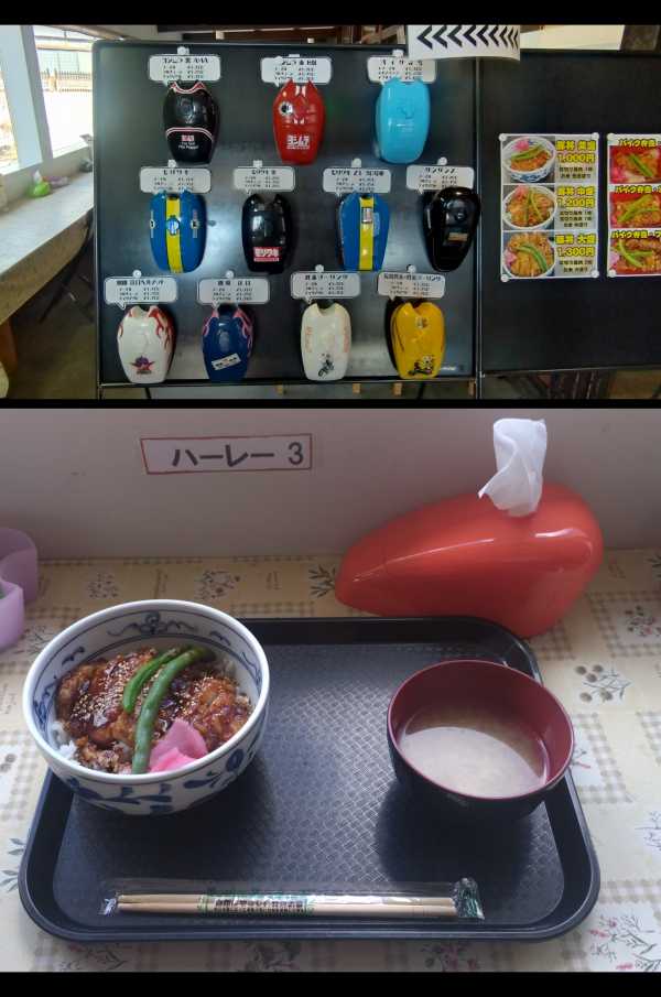 前から気になっていたバイク弁当で豚丼並盛り。ライダーじゃないので、燃料タンクの容器には興味なし(^^; 普通の丼ぶりで。